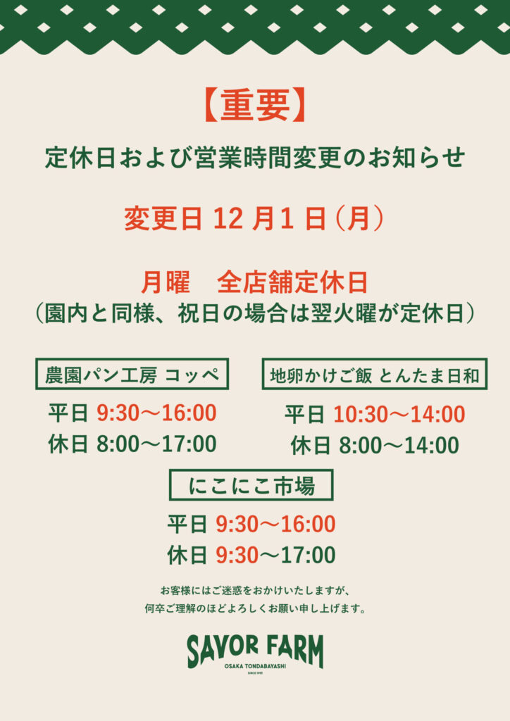 12月1日(月)より下記の通り定休日および営業時間に変更いたします。