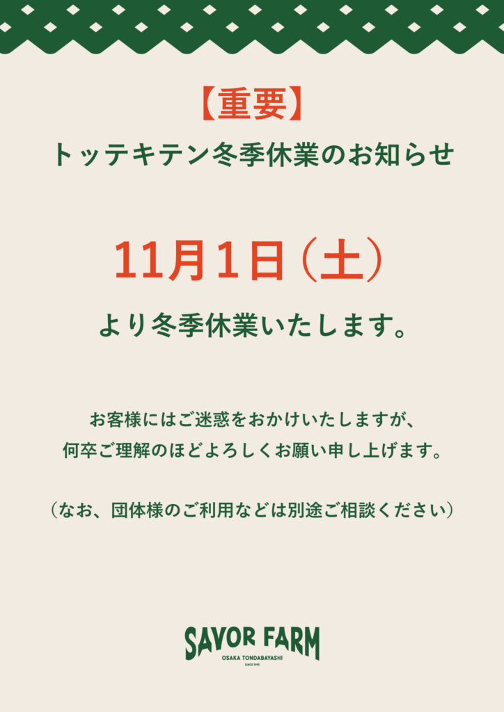 また、ファームグリドルトッテキテンが11月1日(土)より冬季休業になります。