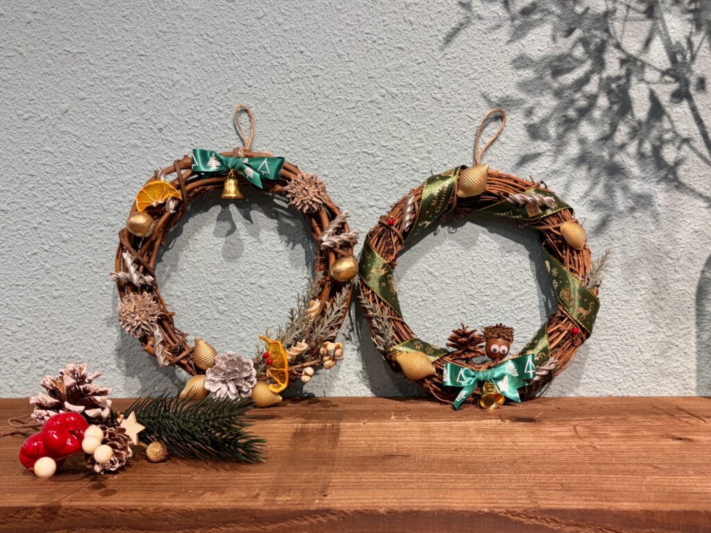 20㎝のリースの土台を使用してサバーファームで取れた自然の素材やかわいいリボン、ベルなど色々な材料から好きに選んでオリジナルのクリスマスリースを作れる体験です!!