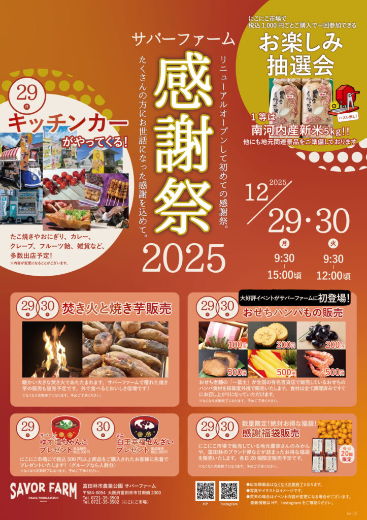 リニューアルオープンして初めての感謝祭。たくさんの方にお世話になった感謝を込めて感謝祭を開催します。12月29日にはキッチンカーが多数出店予定!皆様のご来店お待ちしております。