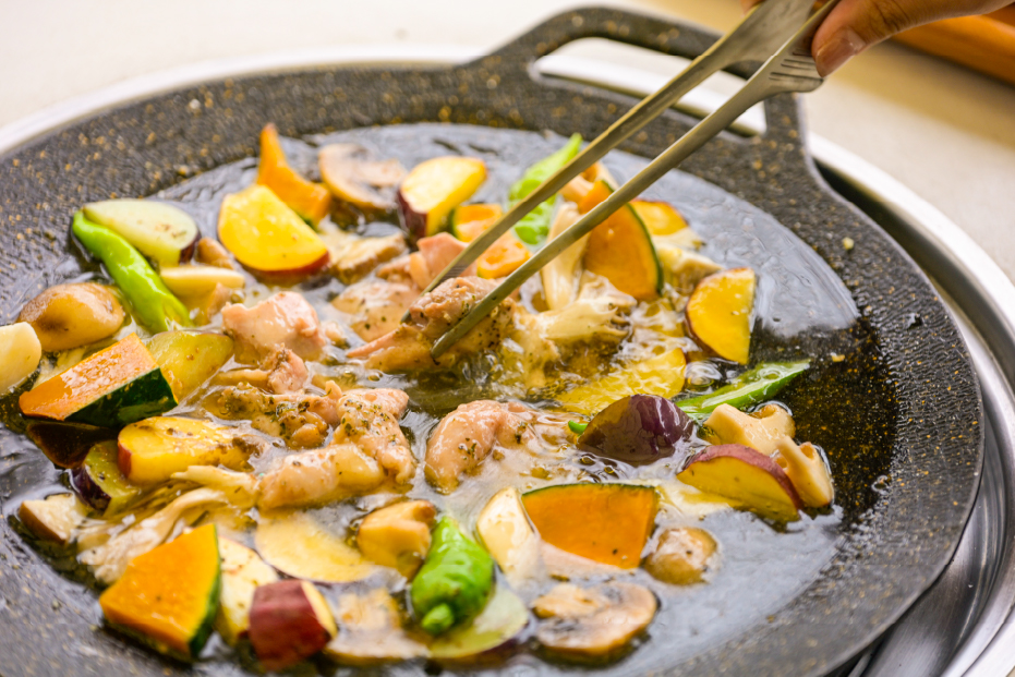 開放的な空間で楽しむ、鉄板スタイルのアウトドア料理。サムギョプサルや彩り野菜たっぷりのアヒージョ、BBQなど、音と香りが食欲をそそるダイナミックな食体験。